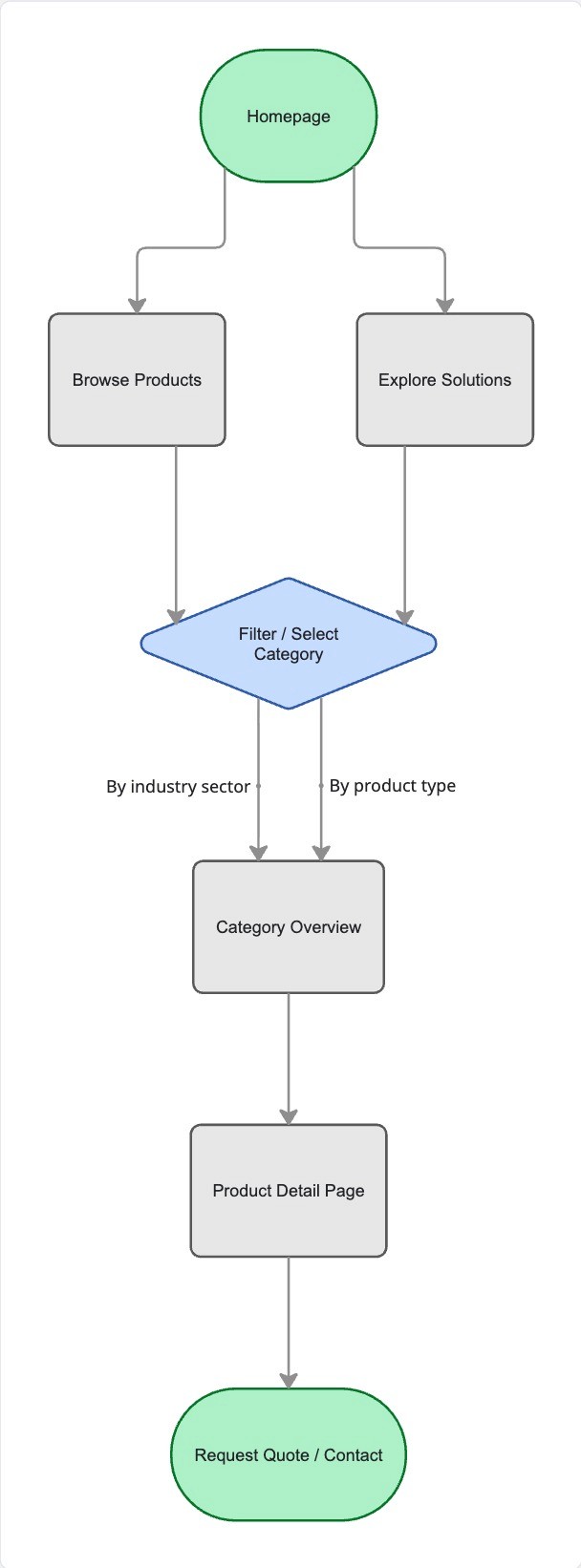A clear content structure was created to organise products, categories and pages across the site. This became the foundation for navigation and future scalability. A dynamic product system was built to handle a wide range of industrial products. Products, categories and templates were structured in the CMS, making it easy to create and manage content going forward. The navigation was redesigned to reflect the new structure and make it easier to move between categories and content.